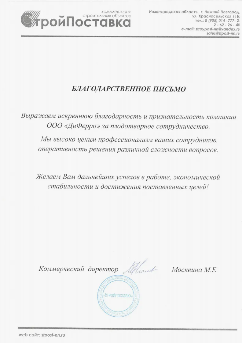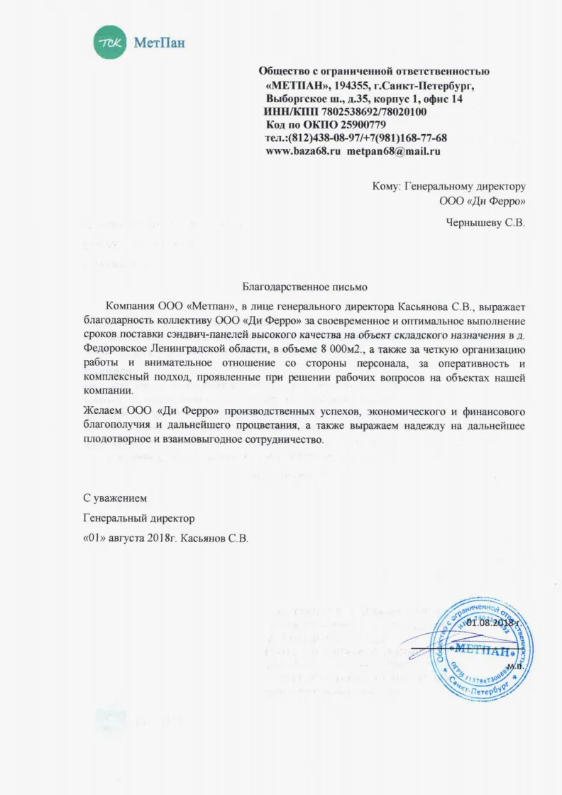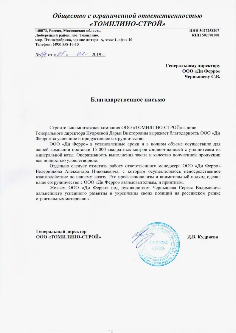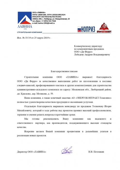 Строительная компания ООО «ЛАВИНА» выражает благодарность ООО «Ди Ферро» за качественное выполнение работ по изготовлению и поставке сэндвич-панелей, профилированного настила и других комплектующих для строительства административно-складского комплекса по адресу: Московская область., Люберецкий район, дп. Красково, дер. Мотяково, д.59.