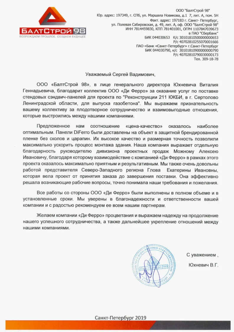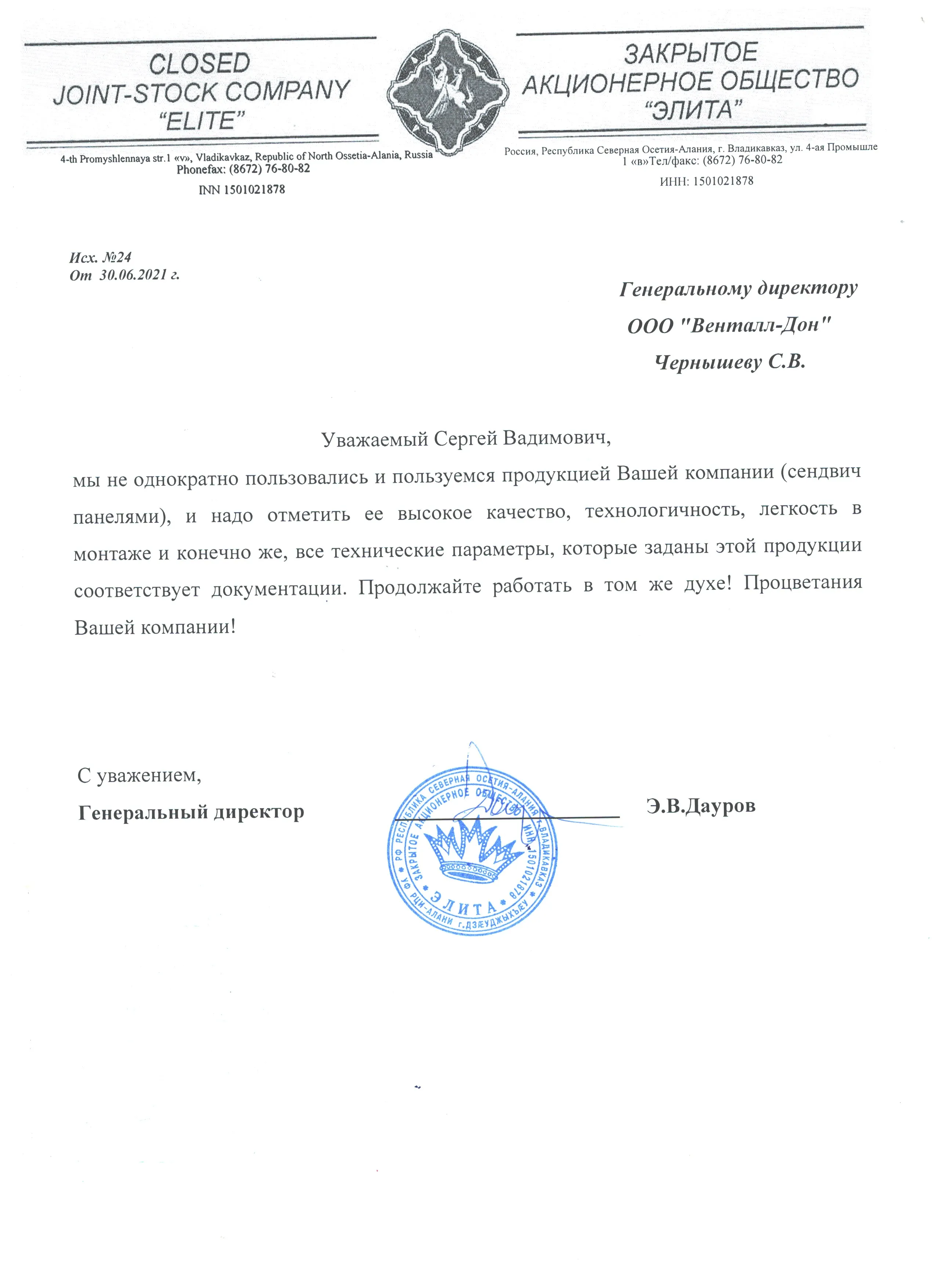Искренне желаем Вашей компании процветания и дальнейших успехов в реализации новых проектов.
