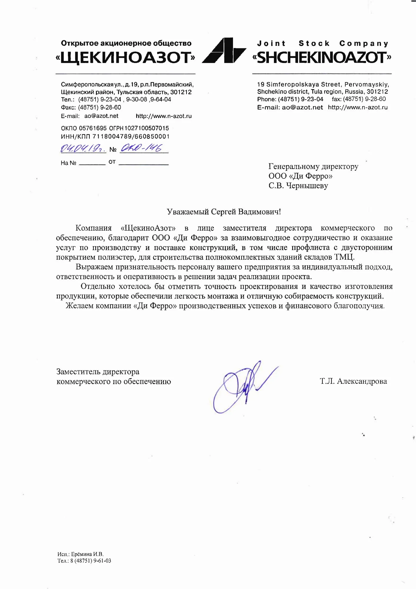 Наша компания, а также конечный заказчик АО «ЭНЕРГОКОНТРАКТ-Томилино» полностью удовлетворены качеством продукции и оказанными услугами.