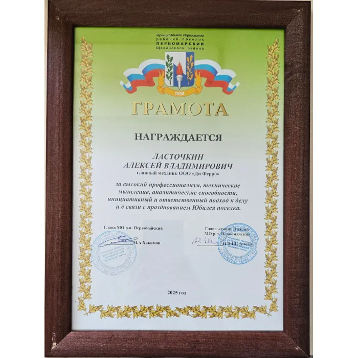 Особую гордость для ООО «Ди Ферро» составило награждение главного механика завода Алексея Владимировича Ласточкина.